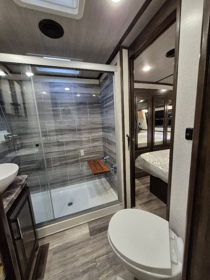 • Step-in sliding glass shower w/bench